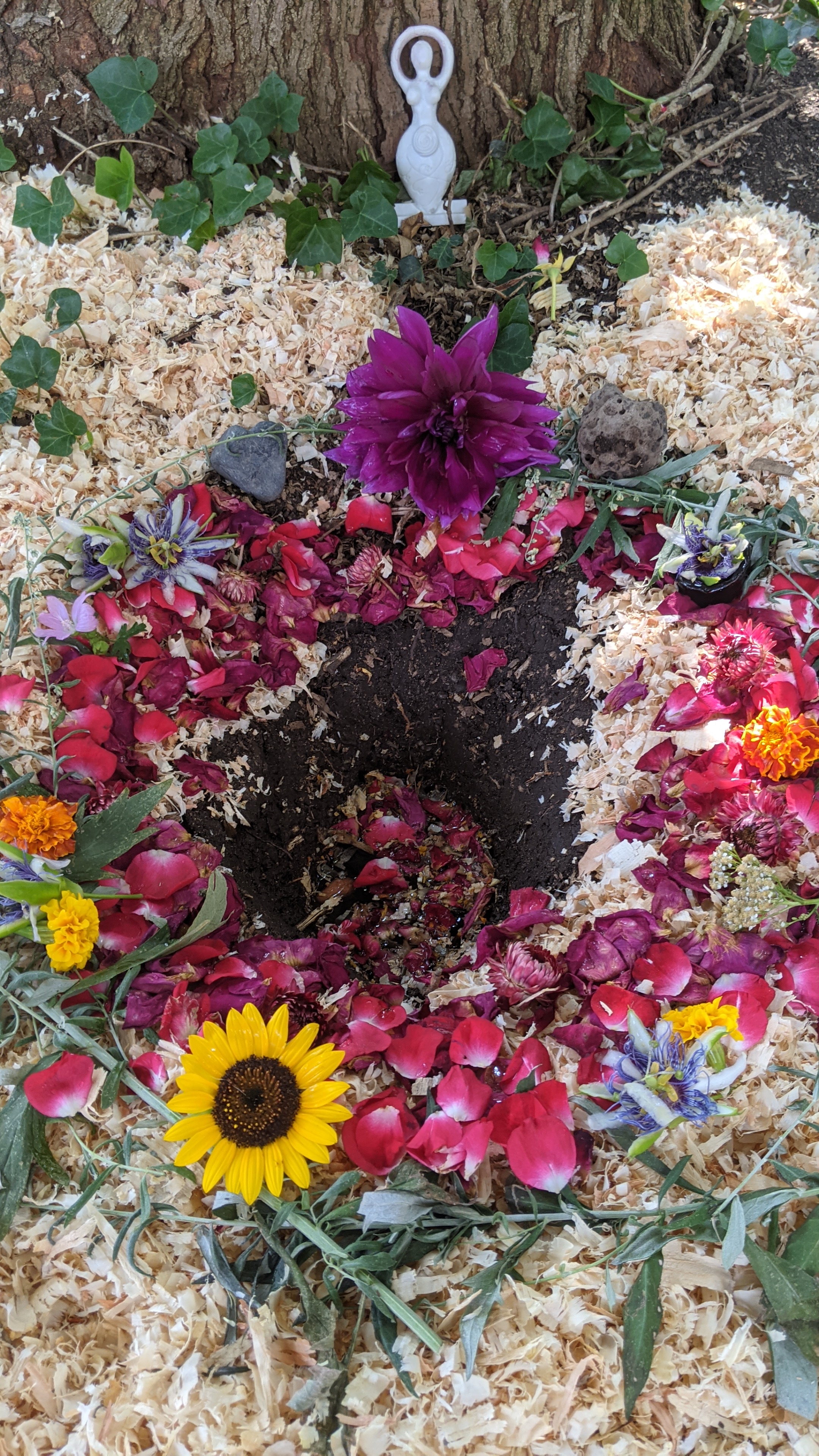 We began by laying a red velvet clothe on the ground at the base of a tree, perhaps it was symbolic of a world tree. We topped the red with a sacred & pure white clothe. We began placing our photos & memorabilia, items such as a Jewish star, A Cherokee poem, a Catholic rosary decorated the altar, which also included candles, incense, alcohol, chocolate, fruit, toys, clothes, crystals, bowls, feathers, jewelry, essential oils, flowers. We collectively adorned a space filled with beauty, with heartfelt prayers, in deep reverence, we built our group ancestral altar and we allowed that sacred space to sit under the tree for 9 long days and nights.