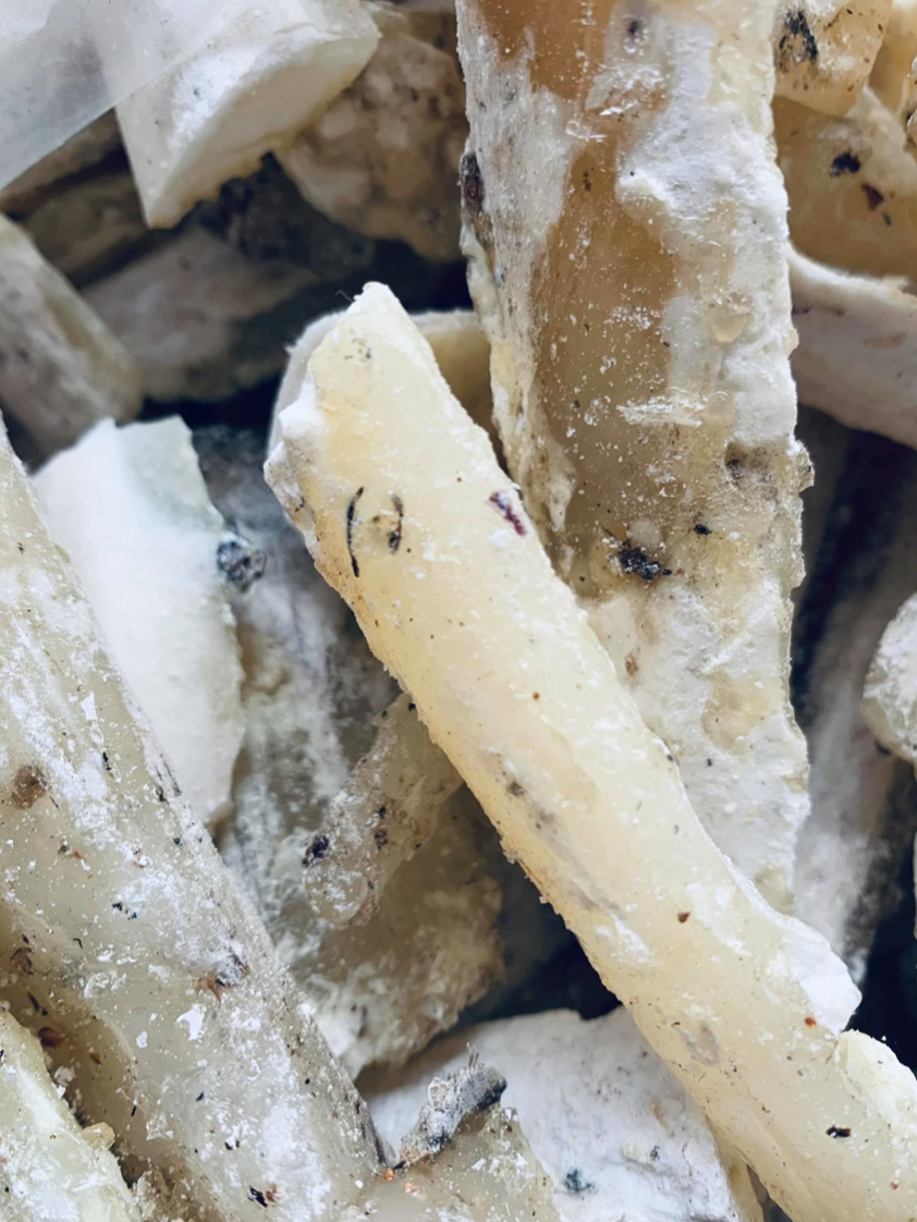 Copaleros, those who extract copal, continue to harvest this sacred resin in a manner similar to their ancestors.  Choosing designated areas in the forest landscapes of their home, and cautious to rotate their chosen trees every few years, copaleros use a wooden mallet and large metal knife, with prayers and respect, they place a small cut into the tree. Below these abrasions, which appear to ‘bleed’, the resin is caught, as it oozes from the tree trunks, by large maguey spikes held in place with rope.